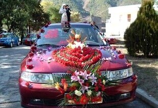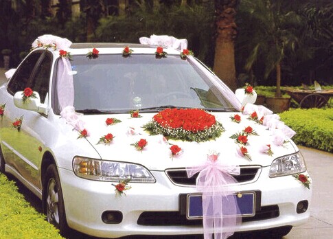 車門鮮花裝飾必不可少,能起到畫(huà)龍點(diǎn)睛的作用。普通的裝飾以1-2朵月季、扶郎、康乃馨配以少許葉材花卉,品種忌混用,用包裝紙包裝,扎上蝴蝶結(jié),再用包裝帶、膠帶紙將其固定在車門的把手上即可。若是高檔的裝飾,則用紅掌、百合、跳舞蘭、蝴蝶蘭等高檔花配以少許葉材、滿天星、情人草等配花,扎成小束花,再將其固定在車門把手上。
